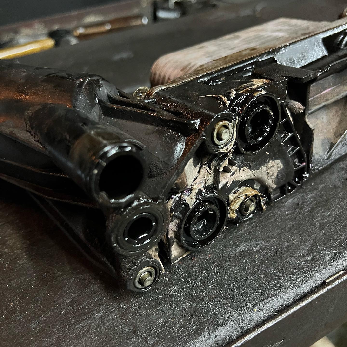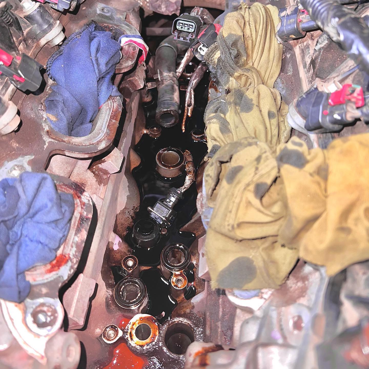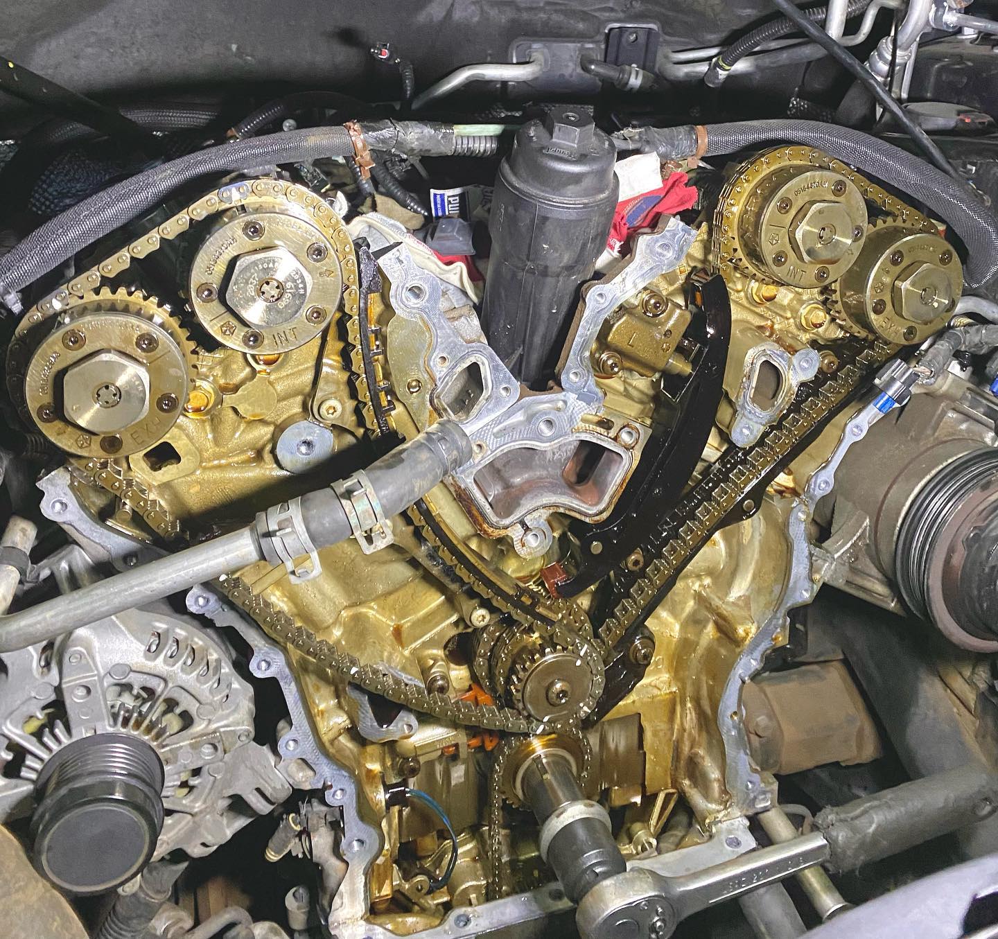 2011 Jeep Grand Cherokee in our shop for an emergency service. The vehicle came in with a severe oil and coolant leak which we quickly diagnosed to a faulty oil cooler and coolant hose. Hose replaced, oil cooler replaced.